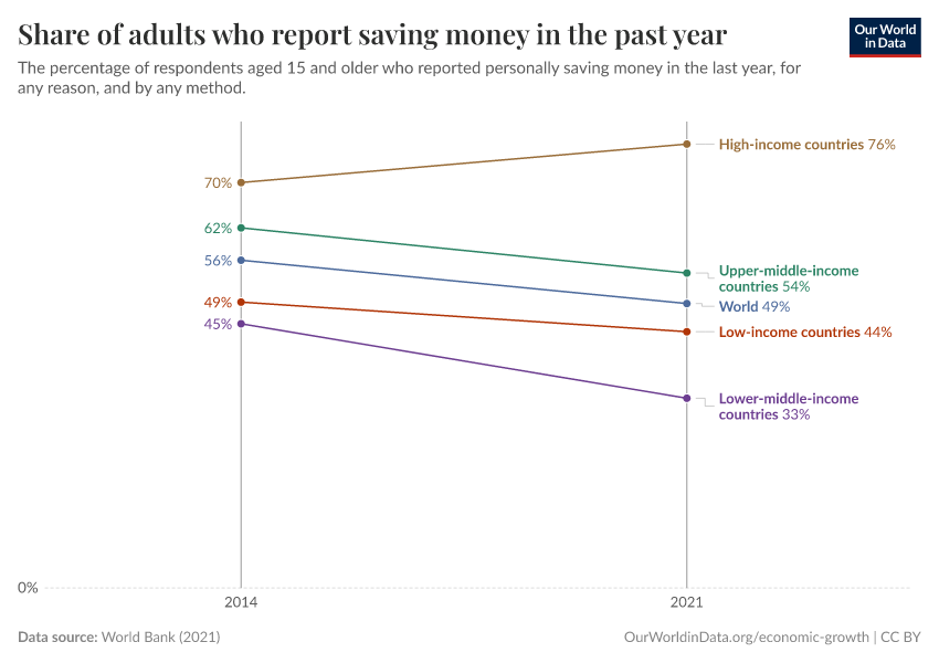 World Bank (2021) – with minor processing by Our World in Data. “Share of adults who report saving money in the past year” [dataset]. World Bank, “The Global Findex Database” [original data]. Retrieved December 29, 2025 from https://data-forest-share-update.owid.pages.dev:8789/20250909-093708/grapher/share-of-adults-who-report-saving-money-in-the-past-year.html (archived on September 9, 2025).