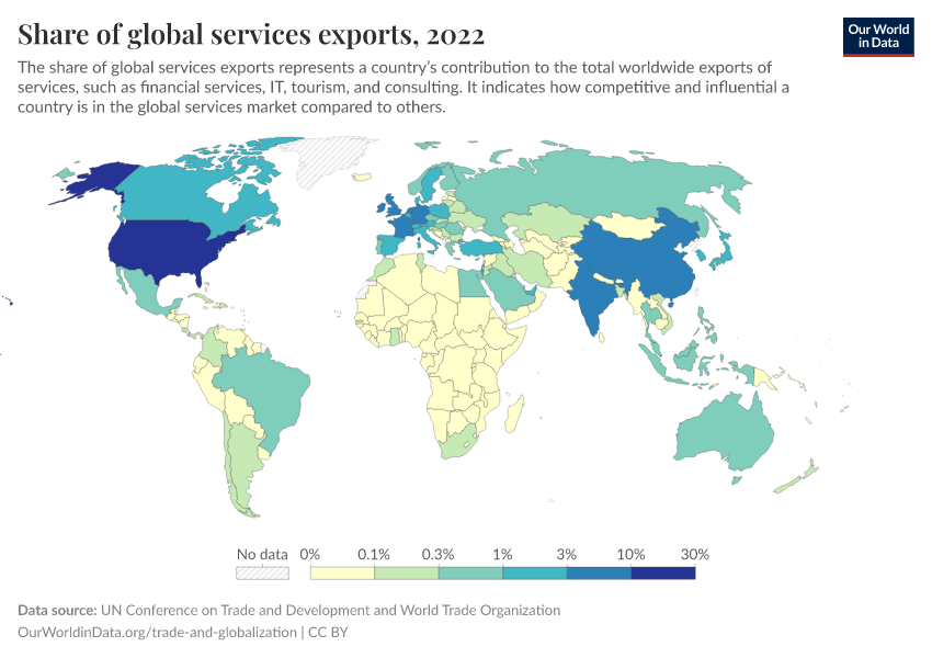 “Data Page: Share of global services exports”. Our World in Data (2025). Data adapted from UN Conference on Trade and Development and World Trade Organization. Retrieved from https://data-forest-share-update.owid.pages.dev:8789/20251125-165536/grapher/share-of-global-services-exports.html [online resource] (archived on November 25, 2025).How to cite this data