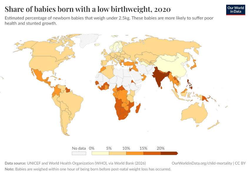 “Data Page: Share of babies born with a low birthweight”. Our World in Data (2025). Data adapted from UNICEF and World Health Organization (WHO), via World Bank. Retrieved from https://data-forest-share-update.owid.pages.dev:8789/20250916-103535/grapher/share-of-low-birthweight-babies-born.html [online resource] (archived on September 16, 2025).How to cite this data