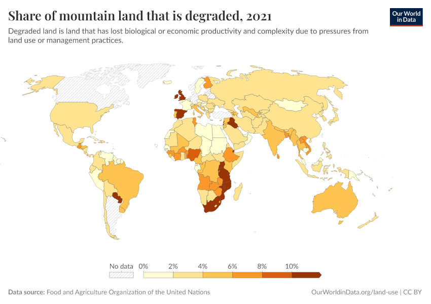“Data Page: Share of mountain land that is degraded”. Our World in Data (2025). Data adapted from Food and Agriculture Organization of the United Nations. Retrieved from https://data-forest-share-update.owid.pages.dev:8789/20251125-165536/grapher/share-of-mountain-land-that-is-degraded.html [online resource] (archived on November 25, 2025).How to cite this data