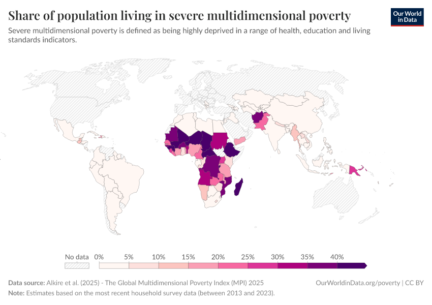 “Data Page: Share of population living in severe multidimensional poverty”, part of the following publication: Joe Hasell, Bertha Rohenkohl, Pablo Arriagada, Esteban Ortiz-Ospina, and Max Roser (2022) - “Poverty”. Data adapted from Alkire, Kanagaratnam and Suppa. Retrieved from https://data-forest-share-update.owid.pages.dev:8789/20251209-133038/grapher/share-of-population-in-severe-multidimensional-poverty.html [online resource] (archived on December 9, 2025).How to cite this data