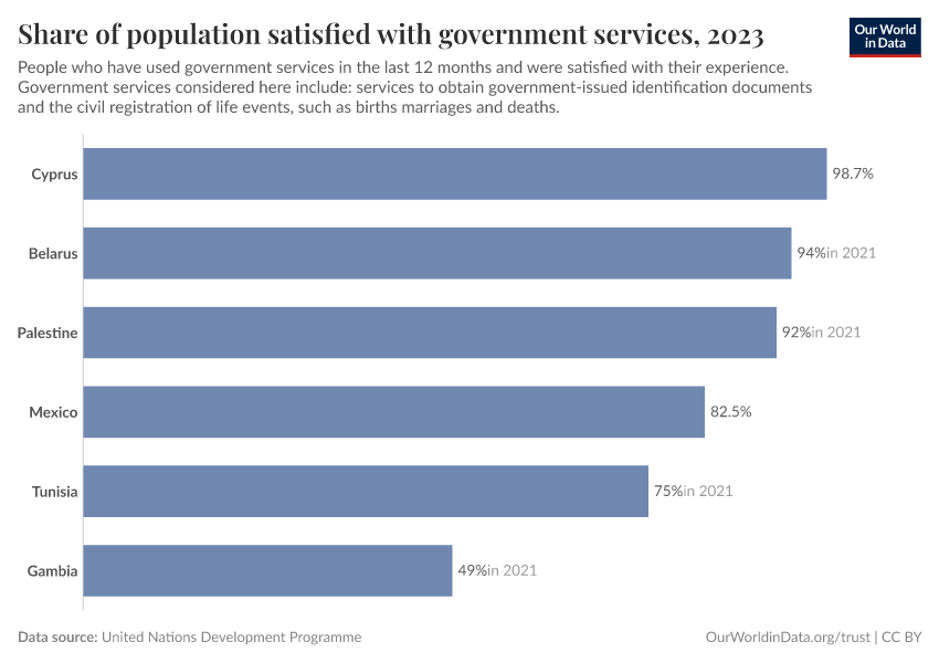 “Data Page: Share of population satisfied with government services”. Our World in Data (2025). Data adapted from United Nations Development Programme. Retrieved from https://data-forest-share-update.owid.pages.dev:8789/20251120-211749/grapher/share-of-population-satisfied-with-government-services.html [online resource] (archived on November 20, 2025).How to cite this data