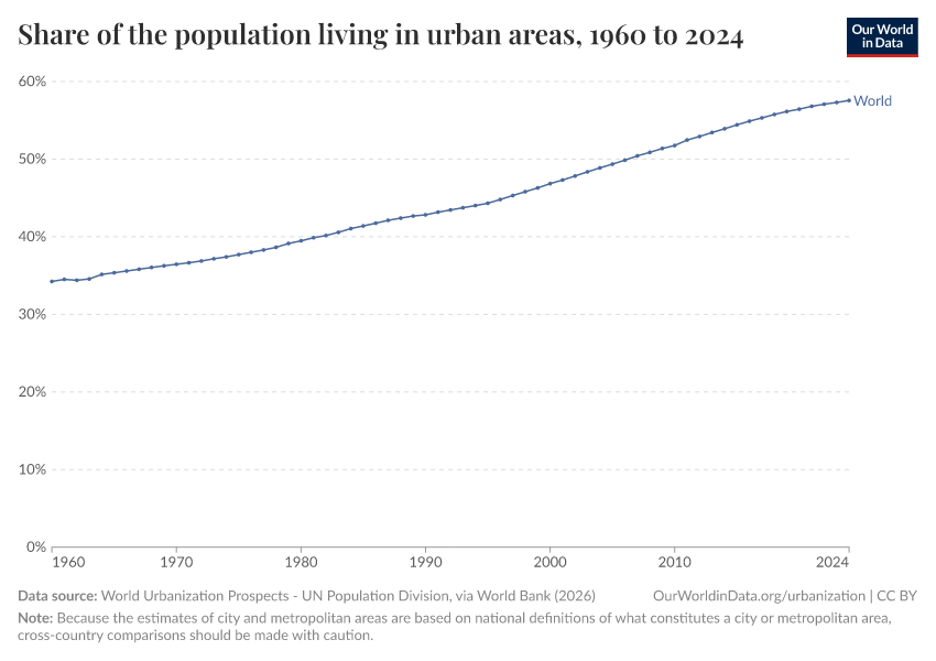 “Data Page: Share of the population living in urban areas”. Our World in Data (2025). Data adapted from World Urbanization Prospects - UN Population Division, via World Bank. Retrieved from https://data-forest-share-update.owid.pages.dev:8789/20250916-102301/grapher/share-of-population-urban.html [online resource] (archived on September 16, 2025).How to cite this data