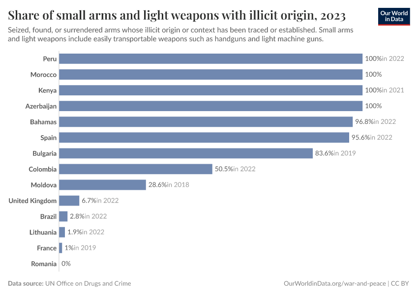 “Data Page: Share of small arms and light weapons with illicit origin”. Our World in Data (2025). Data adapted from UN Office on Drugs and Crime. Retrieved from https://data-forest-share-update.owid.pages.dev:8789/20251204-144539/grapher/share-of-small-with-illicit-origin.html [online resource] (archived on December 4, 2025).How to cite this data