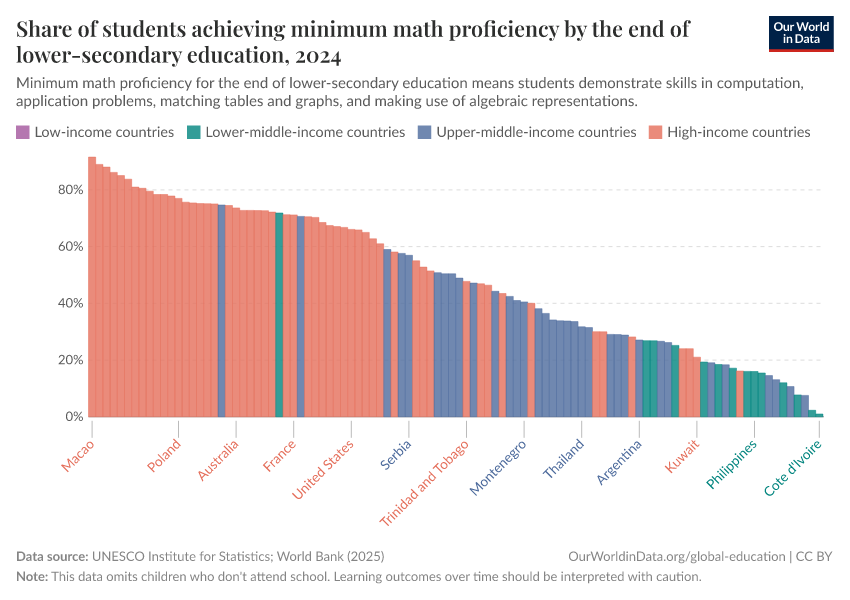 UNESCO Institute for Statistics – processed by Our World in Data. “Share of students achieving minimum math proficiency by the end of lower-secondary education” [dataset]. UNESCO Institute for Statistics, “Data from multiple sources” [original data]. Retrieved December 29, 2025 from https://data-forest-share-update.owid.pages.dev:8789/20251125-165536/grapher/share-of-students-at-end-of-lower-secondary-education-achieving-minimum-math-proficiency.html (archived on November 25, 2025).