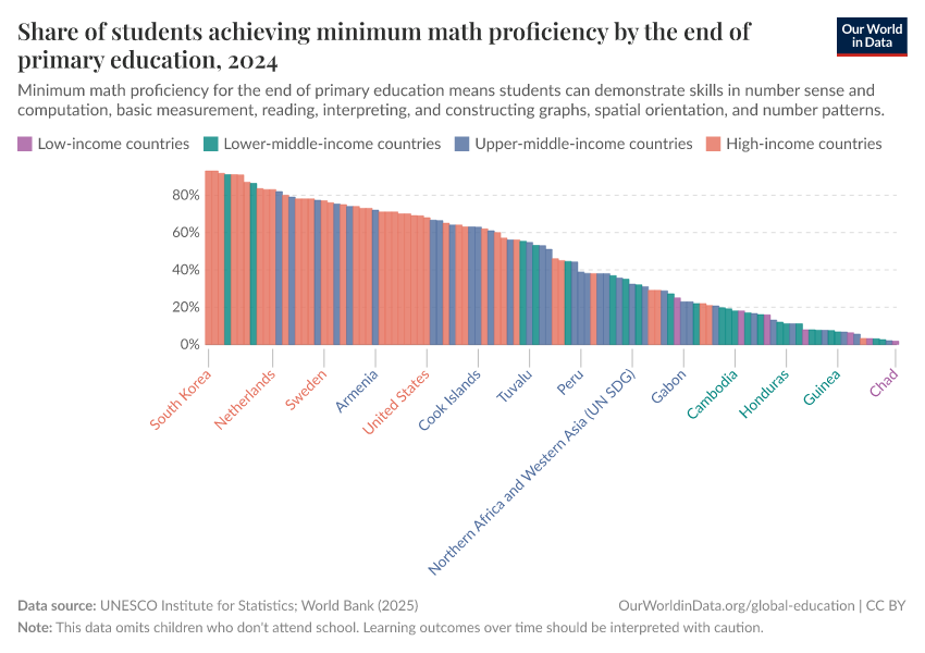 UNESCO Institute for Statistics – processed by Our World in Data. “Share of students achieving minimum math proficiency by the end of primary education” [dataset]. UNESCO Institute for Statistics, “Data from multiple sources” [original data]. Retrieved December 29, 2025 from https://data-forest-share-update.owid.pages.dev:8789/20251125-165536/grapher/share-of-students-at-end-of-primary-education-achieving-minimum-math-proficiency.html (archived on November 25, 2025).