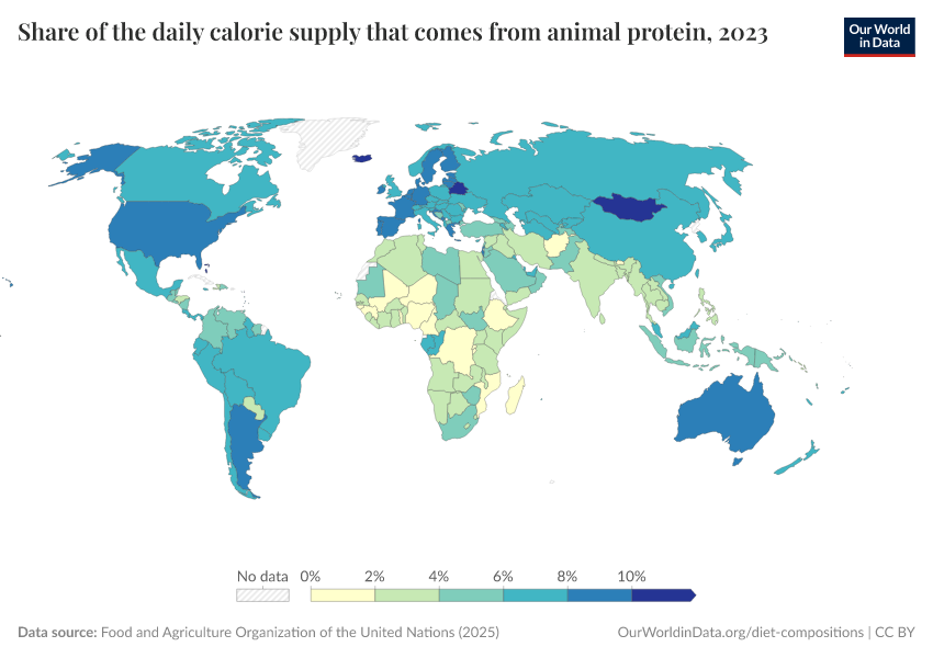 “Data Page: Share of the daily calorie supply that comes from animal protein”, part of the following publication: Hannah Ritchie, Pablo Rosado, and Max Roser (2023) - “Agricultural Production”. Data adapted from Food and Agriculture Organization of the United Nations. Retrieved from https://data-forest-share-update.owid.pages.dev:8789/20251014-163147/grapher/share-of-the-daily-calorie-supply-that-comes-from-animal-protein.html [online resource] (archived on October 14, 2025).How to cite this data