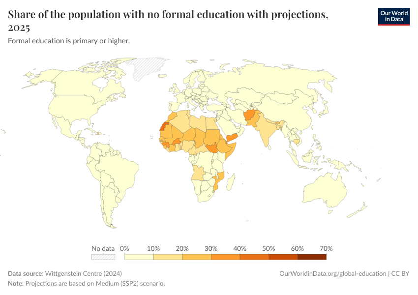 “Data Page: Share of the population with no formal education with projections”, part of the following publication: Hannah Ritchie, Veronika Samborska, Natasha Ahuja, Esteban Ortiz-Ospina, and Max Roser (2023) - “Global Education”. Data adapted from Wittgenstein Centre. Retrieved from https://data-forest-share-update.owid.pages.dev:8789/20250909-093708/grapher/share-of-the-population-with-no-formal-education-with-projections.html [online resource] (archived on September 9, 2025).How to cite this data