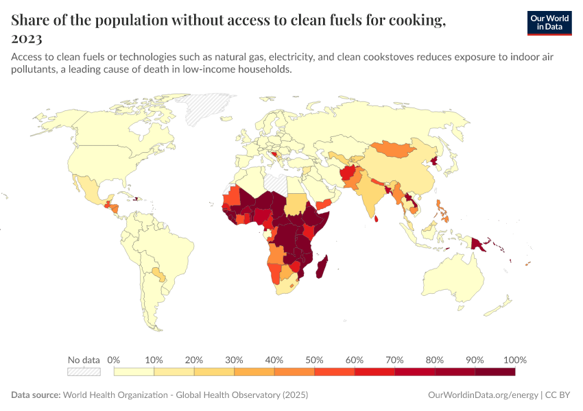 World Health Organization - Global Health Observatory (2025) – processed by Our World in Data. “Share of the population without access to clean fuels for cooking” [dataset]. World Health Organization, “Global Health Observatory” [original data]. Retrieved December 29, 2025 from https://data-forest-share-update.owid.pages.dev:8789/20250909-093708/grapher/share-of-the-population-without-access-to-clean-fuels-for-cooking.html (archived on September 9, 2025).