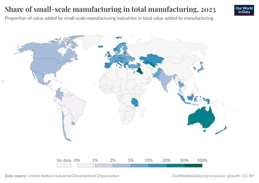 “Data Page: Share of small-scale manufacturing in total manufacturing”. Our World in Data (2025). Data adapted from United Nations Industrial Development Organization. Retrieved from https://data-forest-share-update.owid.pages.dev:8789/20251121-151713/grapher/small-scale-industries-share.html [online resource] (archived on November 21, 2025).How to cite this data