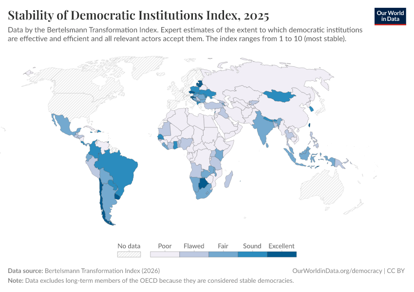 “Data Page: Stability of Democratic Institutions Index”, part of the following publication: Bastian Herre, Lucas Rodés-Guirao, and Esteban Ortiz-Ospina (2013) - “Democracy”. Data adapted from Bertelsmann Transformation Index. Retrieved from https://data-forest-share-update.owid.pages.dev:8789/20251209-133038/grapher/stability-democratic-institutions-index-bti.html [online resource] (archived on December 9, 2025).How to cite this data
