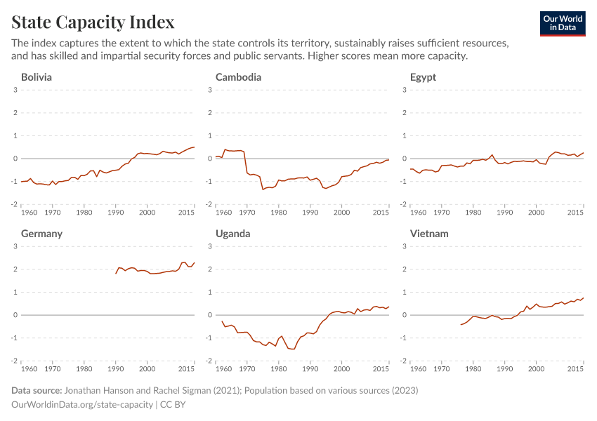 “Data Page: State Capacity Index”, part of the following publication: Bastian Herre and Pablo Arriagada (2023) - “State Capacity”. Data adapted from Jonathan Hanson and Rachel Sigman, Various sources. Retrieved from https://data-forest-share-update.owid.pages.dev:8789/20251127-170114/grapher/state-capacity-index.html [online resource] (archived on November 27, 2025).How to cite this data