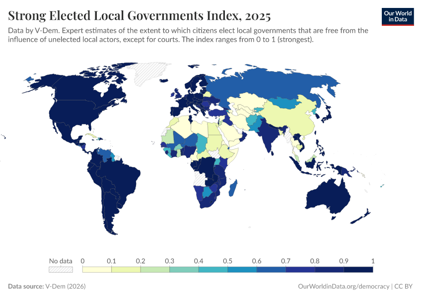 “Data Page: Elected local governments”, part of the following publication: Bastian Herre, Lucas Rodés-Guirao, and Esteban Ortiz-Ospina (2013) - “Democracy”. Data adapted from V-Dem. Retrieved from https://data-forest-share-update.owid.pages.dev:8789/20251209-133038/grapher/strong-elected-local-governments-index.html [online resource] (archived on December 9, 2025).How to cite this data