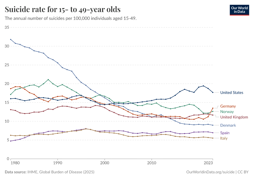 IHME, Global Burden of Disease (2024) – with minor processing by Our World in Data. “Suicide rate for 15- to 49-year olds” [dataset]. IHME, Global Burden of Disease, “Global Burden of Disease - Deaths and DALYs” [original data]. Retrieved December 29, 2025 from https://data-forest-share-update.owid.pages.dev:8789/20250909-093708/grapher/suicide-rate-for-15--to-49-year-olds.html (archived on September 9, 2025).