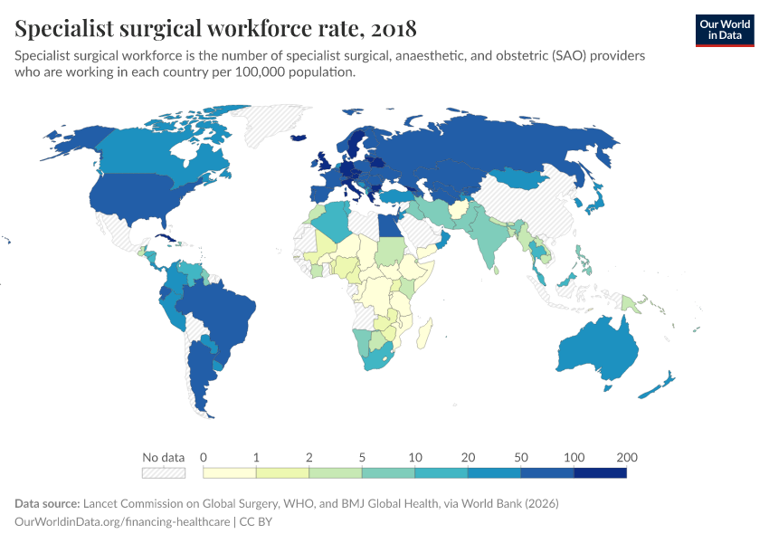 “Data Page: Specialist surgical workforce rate”. Our World in Data (2025). Data adapted from Lancet Commission on Global Surgery, WHO, and BMJ Global Health, via World Bank. Retrieved from https://data-forest-share-update.owid.pages.dev:8789/20250916-102301/grapher/surgeons-per-100000.html [online resource] (archived on September 16, 2025).How to cite this data