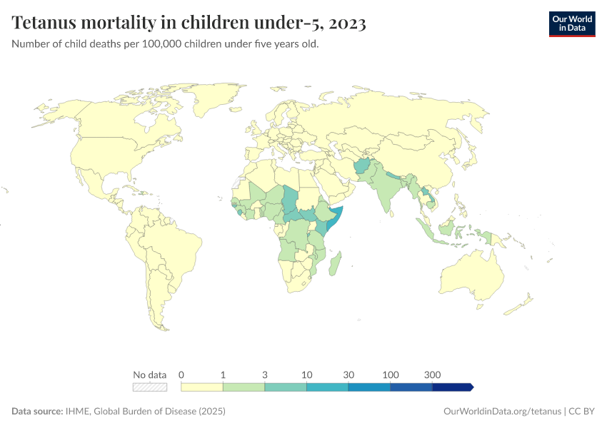 IHME, Global Burden of Disease (2024) – with minor processing by Our World in Data. “Tetanus mortality in children under-5” [dataset]. IHME, Global Burden of Disease, “Global Burden of Disease - Deaths and DALYs” [original data]. Retrieved December 29, 2025 from https://data-forest-share-update.owid.pages.dev:8789/20250909-093708/grapher/tetanus-mortality-in-children-under-5.html (archived on September 9, 2025).