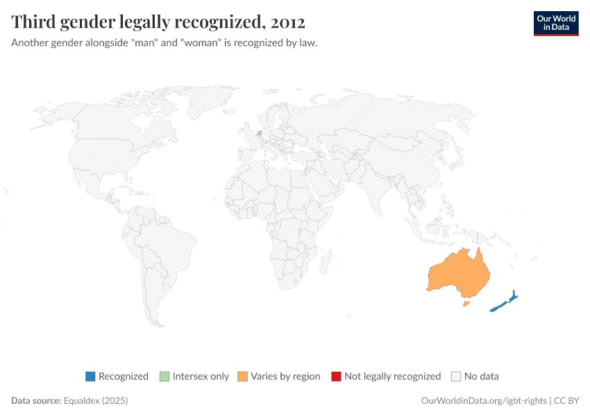 “Data Page: Third gender legally recognized”, part of the following publication: Bastian Herre and Pablo Arriagada (2023) - “LGBT+ Rights”. Data adapted from Equaldex. Retrieved from https://data-forest-share-update.owid.pages.dev:8789/20250909-093708/grapher/third-gender-recognition-equaldex.html [online resource] (archived on September 9, 2025).How to cite this data