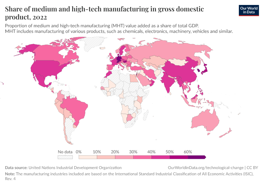 “Data Page: Share of medium and high-tech manufacturing in gross domestic product”. Our World in Data (2025). Data adapted from United Nations Industrial Development Organization. Retrieved from https://data-forest-share-update.owid.pages.dev:8789/20251120-211038/grapher/total-manufacturing-value-added-from-high-tech.html [online resource] (archived on November 20, 2025).How to cite this data