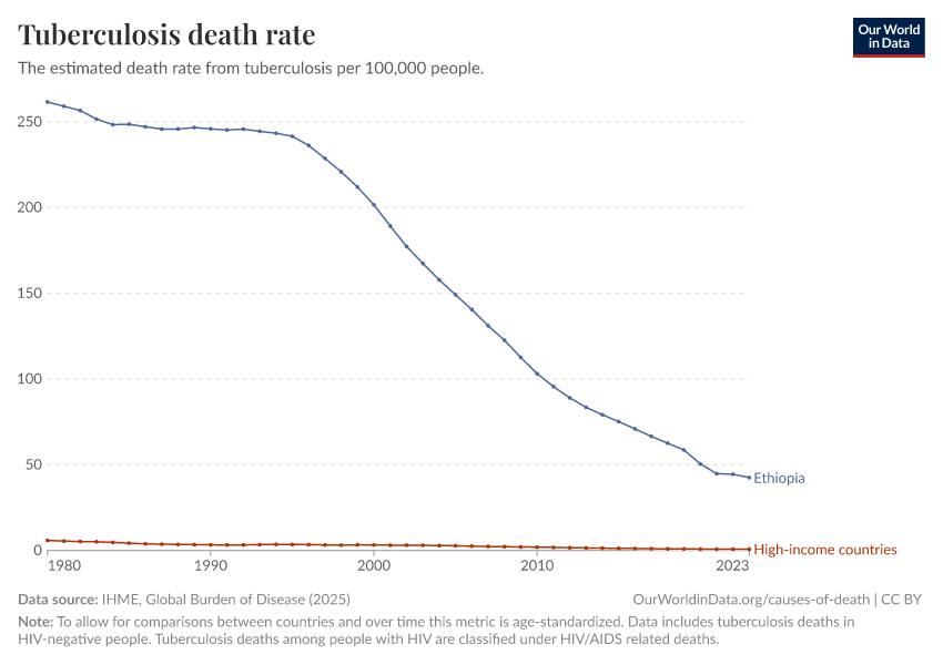 “Data Page: Tuberculosis death rate”, part of the following publication: Esteban Ortiz-Ospina and Max Roser (2016) - “Global Health”. Data adapted from IHME, Global Burden of Disease. Retrieved from https://data-forest-share-update.owid.pages.dev:8789/20250909-093708/grapher/tuberculosis-death-rates.html [online resource] (archived on September 9, 2025).How to cite this data