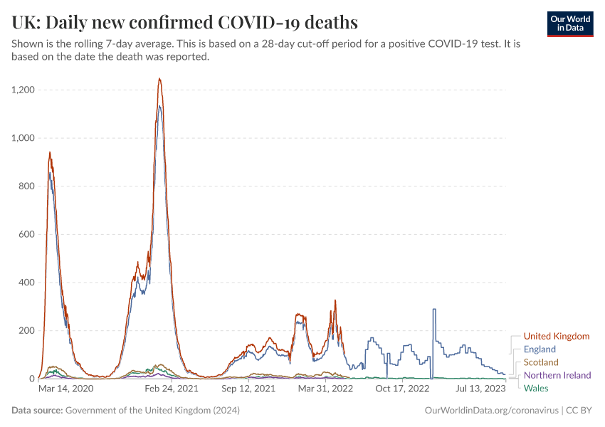 Government of the United Kingdom (2024) – with minor processing by Our World in Data. “UK: Daily new confirmed COVID-19 deaths” [dataset]. Government of the United Kingdom, “UKHSA data dashboard” [original data]. Retrieved December 29, 2025 from https://data-forest-share-update.owid.pages.dev:8789/20250909-093708/grapher/uk-daily-covid-deaths.html (archived on September 9, 2025).