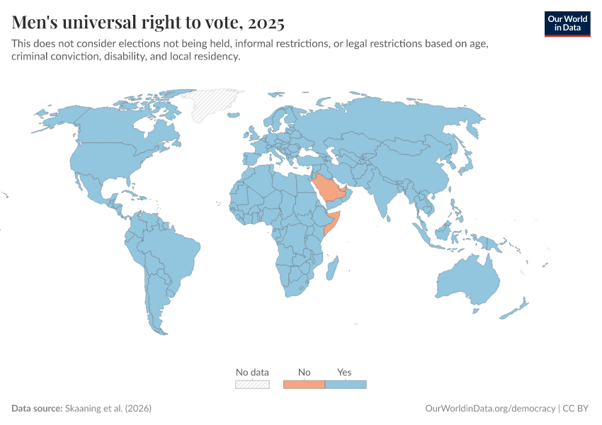 “Data Page: Men's universal right to vote”, part of the following publication: Bastian Herre, Lucas Rodés-Guirao, and Esteban Ortiz-Ospina (2013) - “Democracy”. Data adapted from Skaaning et al.. Retrieved from https://data-forest-share-update.owid.pages.dev:8789/20250909-093708/grapher/universal-suffrage-men-lexical.html [online resource] (archived on September 9, 2025).How to cite this data