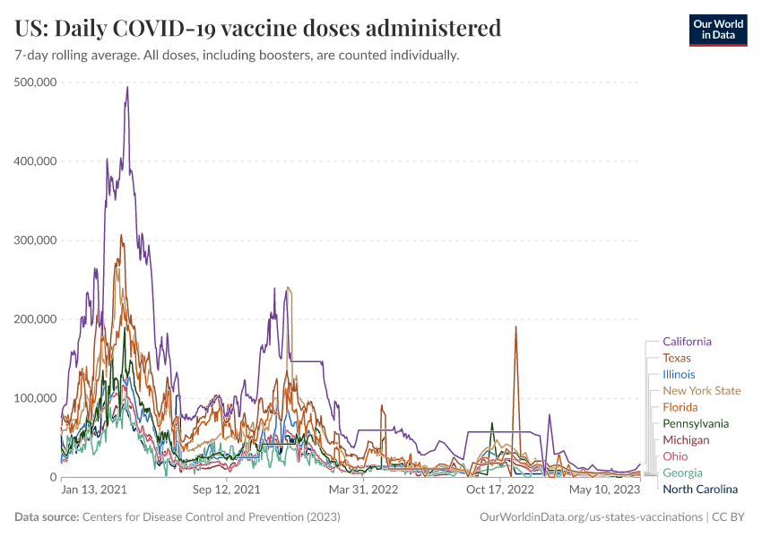 Centers for Disease Control and Prevention (2023) – processed by Our World in Data. “US: Daily COVID-19 vaccine doses administered” [dataset]. Centers for Disease Control and Prevention, “COVID-19, Vaccinations (United States)” [original data]. Retrieved December 29, 2025 from https://data-forest-share-update.owid.pages.dev:8789/20250909-093708/grapher/us-daily-covid-vaccine-doses-administered.html (archived on September 9, 2025).