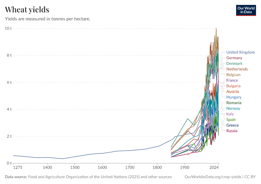 Food and Agriculture Organization of the United Nations (2025); Broadberry et al. (2015); Brassley (2000); Bayliss-Smith & Wanmali (1984) – with major processing by Our World in Data. “Wheat yields” [dataset]. Food and Agriculture Organization of the United Nations, “Production: Crops and livestock products”; Broadberry et al., “Long-term crop yields in UK”; Brassley, “Long-term crop yields in UK”; Bayliss-Smith & Wanmali, “Understanding Green Revolutions” [original data]. Retrieved December 29, 2025 from https://data-forest-share-update.owid.pages.dev:8789/20251014-161652/grapher/wheat-yields.html (archived on October 14, 2025).
