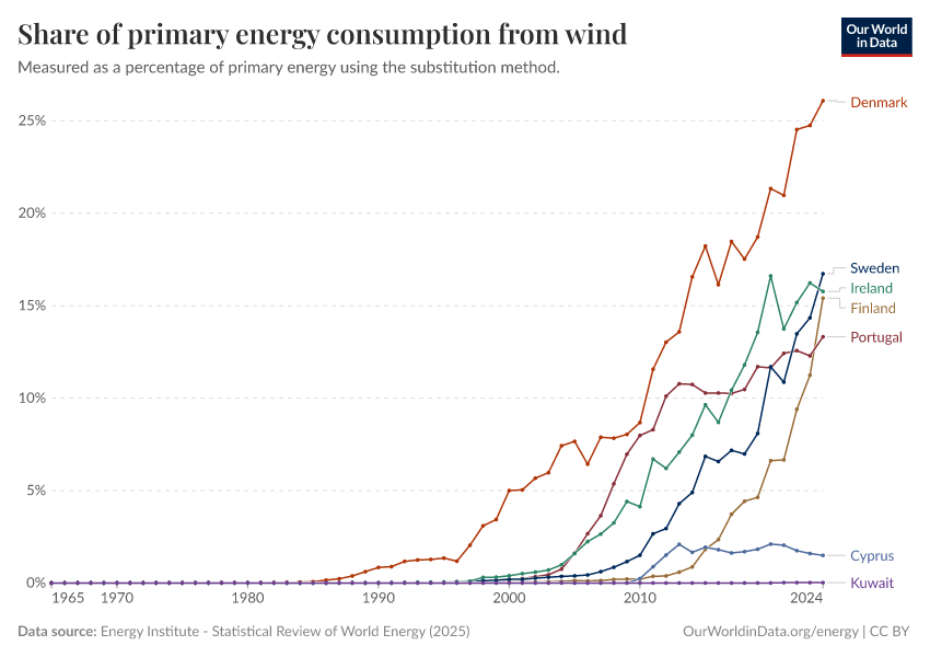 Energy Institute - Statistical Review of World Energy (2025) – with major processing by Our World in Data. “Share of primary energy consumption that comes from wind power – Using the substitution method” [dataset]. Energy Institute, “Statistical Review of World Energy” [original data]. Retrieved December 29, 2025 from https://data-forest-share-update.owid.pages.dev:8789/20250909-093708/grapher/wind-share-energy.html (archived on September 9, 2025).