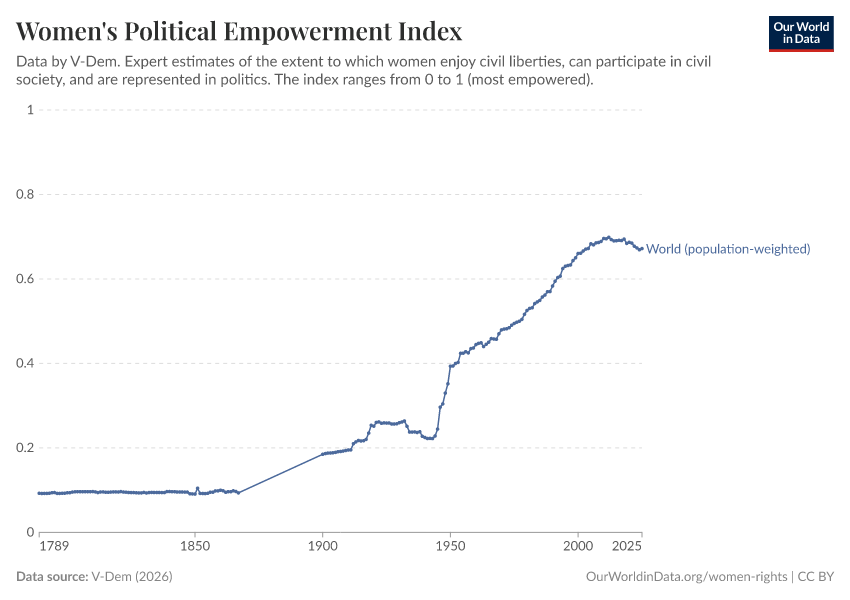 “Data Page: Women's political empowerment index”, part of the following publication: Bastian Herre, Lucas Rodés-Guirao, and Esteban Ortiz-Ospina (2013) - “Democracy”. Data adapted from V-Dem. Retrieved from https://data-forest-share-update.owid.pages.dev:8789/20251209-133038/grapher/women-political-empowerment-index.html [online resource] (archived on December 9, 2025).How to cite this data