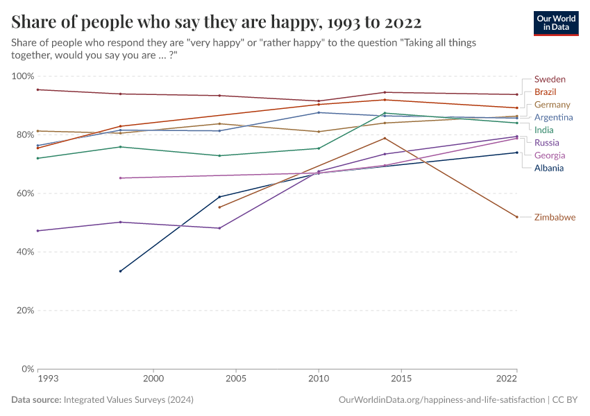 The Integrated Values Surveys collect data from a series of representative national surveys covering almost 100 countries, with the earliest estimates dating back to 1981. In these surveys, respondents are asked: “Taking all things together, would you say you are (i) Very happy, (ii) Rather happy, (iii) Not very happy, or (iv) Not at all happy”. This visualization plots the share of people answering they are “very happy” or “rather happy”.