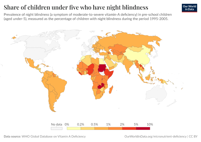 In the map, we see the prevalence of night blindness in children younger than 5 years old over the period 1995–2005.
