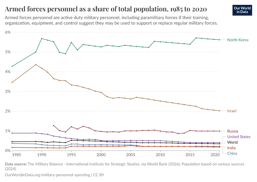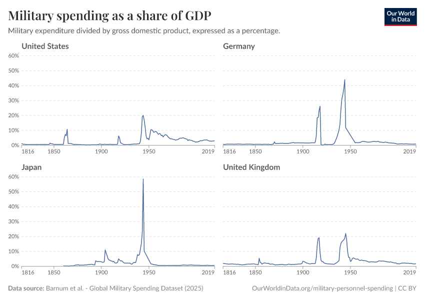 Esteban Ortiz-Ospina (2018) - “Long-run trends in military spending and personnel: four key facts from new data” Published online at OurWorldinData.org. Retrieved from: 'https://data-forest-share-update.owid.pages.dev:8789/20251209-133038/military-long-run-spending-perspective.html' [Online Resource] (archived on December 9, 2025).BibTeX citation