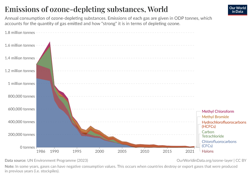During the 1980s, the world came together to form an international agreement to reduce – and eventually eliminate – emissions of these depleting substances. The political agreements were very effective. Since then, global emissions have fallen by more than 99%.