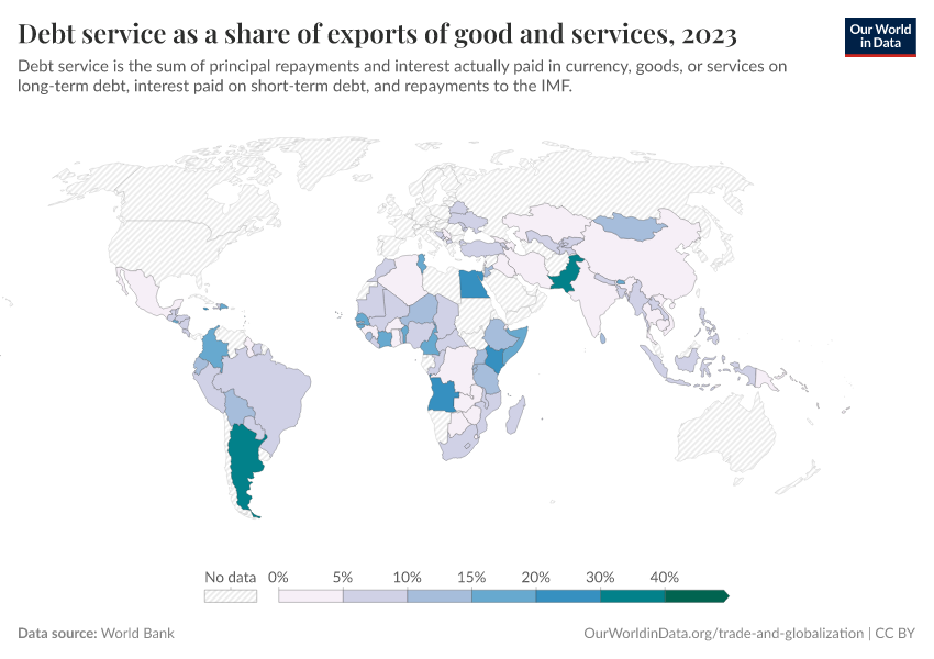 Total debt service is the sum of principal repayments and interest actually paid in currency, goods, or services on long-term debt, interest paid on short-term debt, and repayments (repurchases and charges) to the IMF. This indicator measures total debt service as a share of a country’s exports of goods and services.