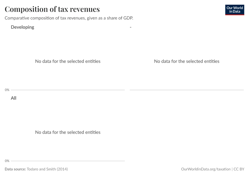 The visualization presents a breakdown of tax revenue sources, comparing figures from 1986 and 1996. The estimates are provided for a selection of country groups (you can switch country groups by clicking on the option 'change country group'), and are expressed as a share of GDP. The data comes from Todaro and Smith (2014)9, and includes direct taxes (corporate and income taxes), as well as indirect taxes (general, commodity, and excise taxes) and social security contributions.