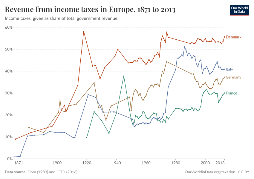 The graph shows the proportion of total government revenue that is accounted for by income taxation. The data plotted corresponds to historical estimates from Flora (1983)4 up until 1975, and more recent estimates, starting 1980, from the International Centre for Tax and Development.