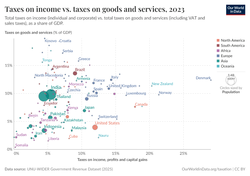 The next visualization plots total revenue from taxes on income and profits (horizontal axis) against revenue from taxes on goods and services (vertical axis), both expressed as a share of GDP.