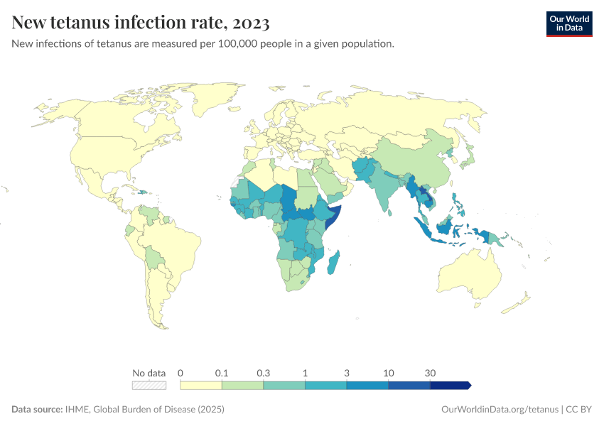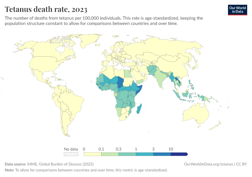 Hannah Behrens, Sophie Ochmann, Bernadeta Dadonaite, and Max Roser (2019) - “Tetanus” Published online at OurWorldinData.org. Retrieved from: 'https://data-forest-share-update.owid.pages.dev/tetanus' [Online Resource]BibTeX citation