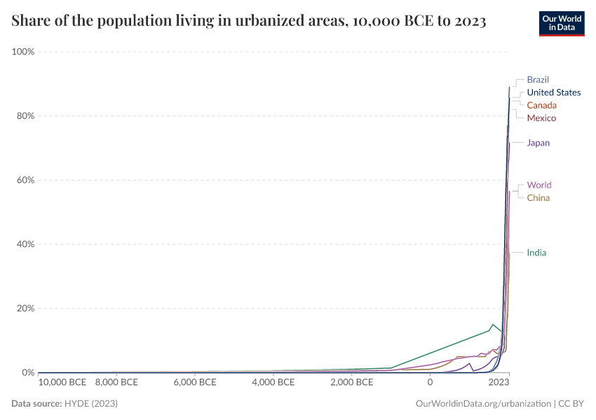 The recency of urbanization becomes even more pronounced when we look at trends for countries and regions over even longer timescales – the past 10,000 years. This is shown in the visualization here, derived from the work of the History Database of the Global Environment.11