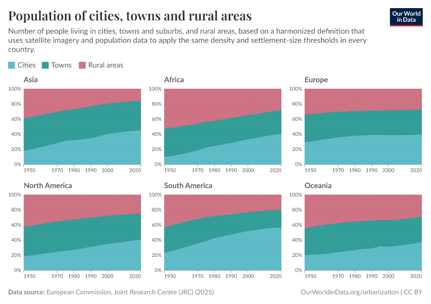 However, the manual on how to apply the Degree of Urbanization recommends reporting figures across three distinct categories—cities, towns, and villages—rather than using a simple urban-rural dichotomy. This approach recognizes urbanization as a continuum, acknowledging that towns occupy a unique position, differing significantly from both cities and villages in their characteristics and needs. The reported cities, and towns population shares by continent are shown in the chart below.