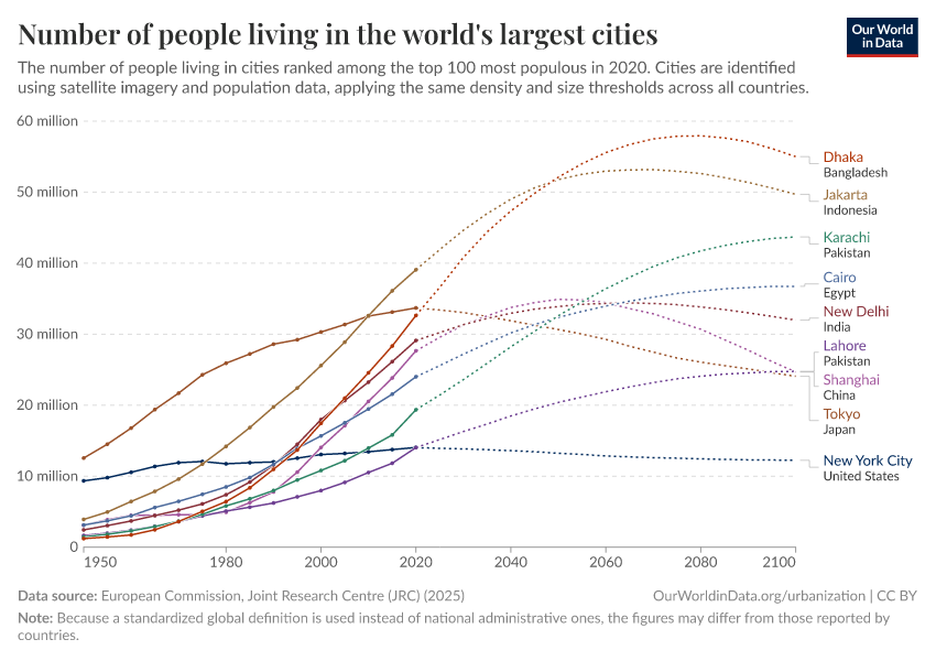 According to the European Commission, Guangzhou — a city in China — was the most populous city in the world, with over 40 million inhabitants. Back in 1975, its population was just over 2 million. Dhaka (the capital of Bangladesh) increased from less than 5 million in 1975 to over 33 million in 2020 (and is projected to reach more than 40 million by 2035).