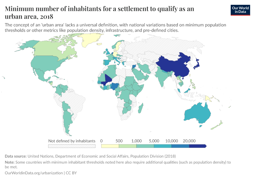 There is currently no universal definition of what 'urban' means. The UN reports figures based on nationally defined urban shares. The problem, however, is that countries adopt very different definitions of urbanization. Not only do the thresholds of urban versus rural vary, but the types of metrics used also differ. Some countries use minimum population thresholds, others use population density, infrastructure development, employment type, or simply the population of pre-defined cities.