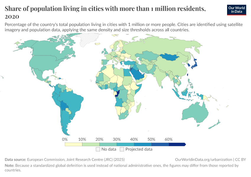 Although the definition of 'urban' gives us some indication of population densities, it does not differentiate between those who live in small versus large urban settings. In the chart, we show the percentage of the total population that lives in agglomerations greater than one million people (i.e. large urban agglomerations). These figures are available in absolute terms (the total number of people living in large urban settings), found here.