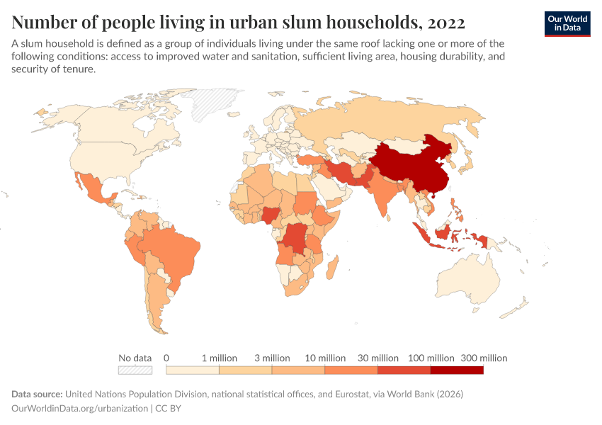 This map shows the total number of people living in urban slum households in each country.