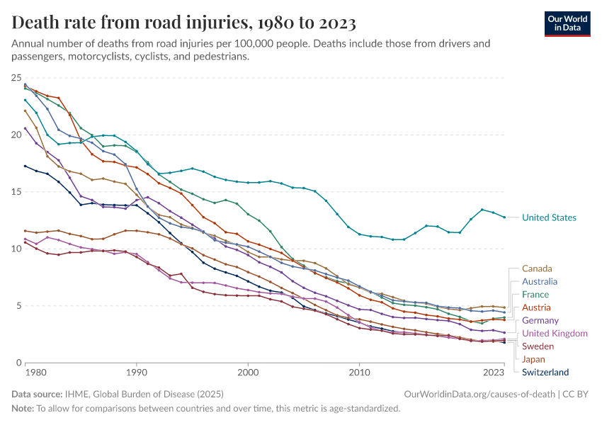 Deaths in road accidents are also much more common in the US than in most other rich countries.