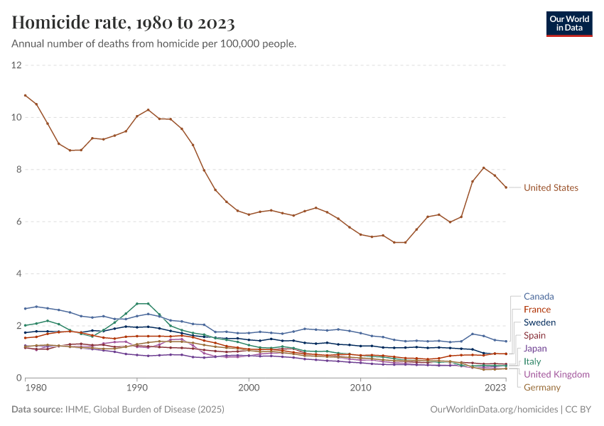 This chart compares homicide rates in the US with a number of other rich countries. No matter which other rich country you add to the chart, you won’t find one with a higher homicide rate. The homicide rate in the US is much higher than in other rich countries.