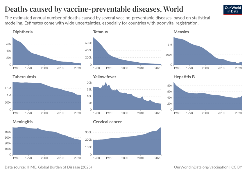 In contrast, the decline in deaths from diseases like hepatitis B and cervical cancer has been more gradual. This is because these diseases typically cause illness and death much later in life, often decades after infection. As a result, the benefits of vaccination take longer to become visible in mortality trends, especially when it was introduced in recent decades.