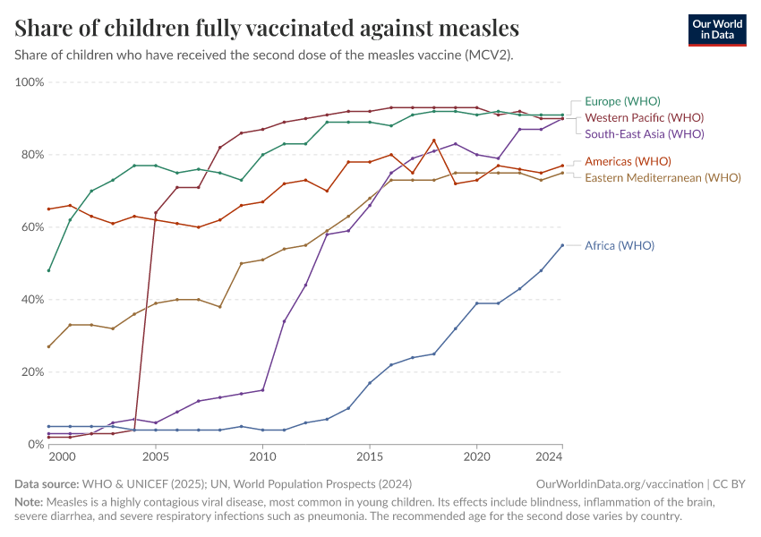 As the next chart shows, global vaccination against measles has increased from less than 20% in 2000 to over 70% today. Remember from earlier that vaccination against measles has saved the most lives.