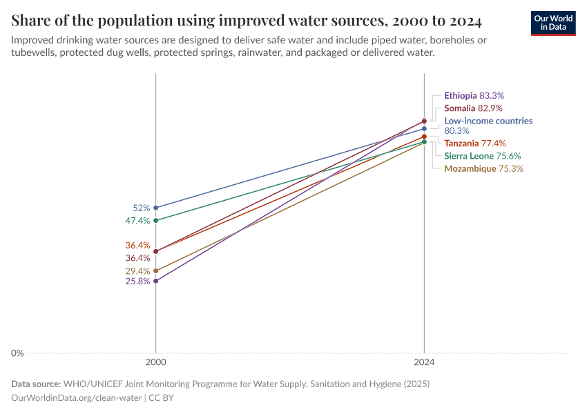 Many countries have rapidly increased this share in the last few decades. In the slope chart, you can see the change in the share of the population with improved water for a selection of countries that still had pretty poor coverage in 2000. In Ethiopia, for example, access has tripled from just 26% to 80%.