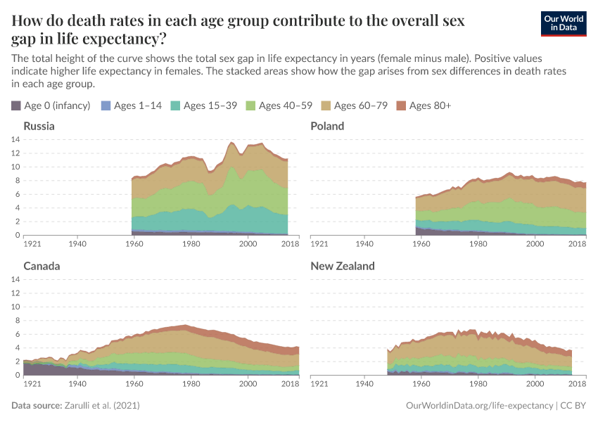 The chart below shows that there are also differences between countries. In Russia and Poland, for example, the overall sex gap in life expectancy is still large due to higher death rates in young and middle-aged men than women.